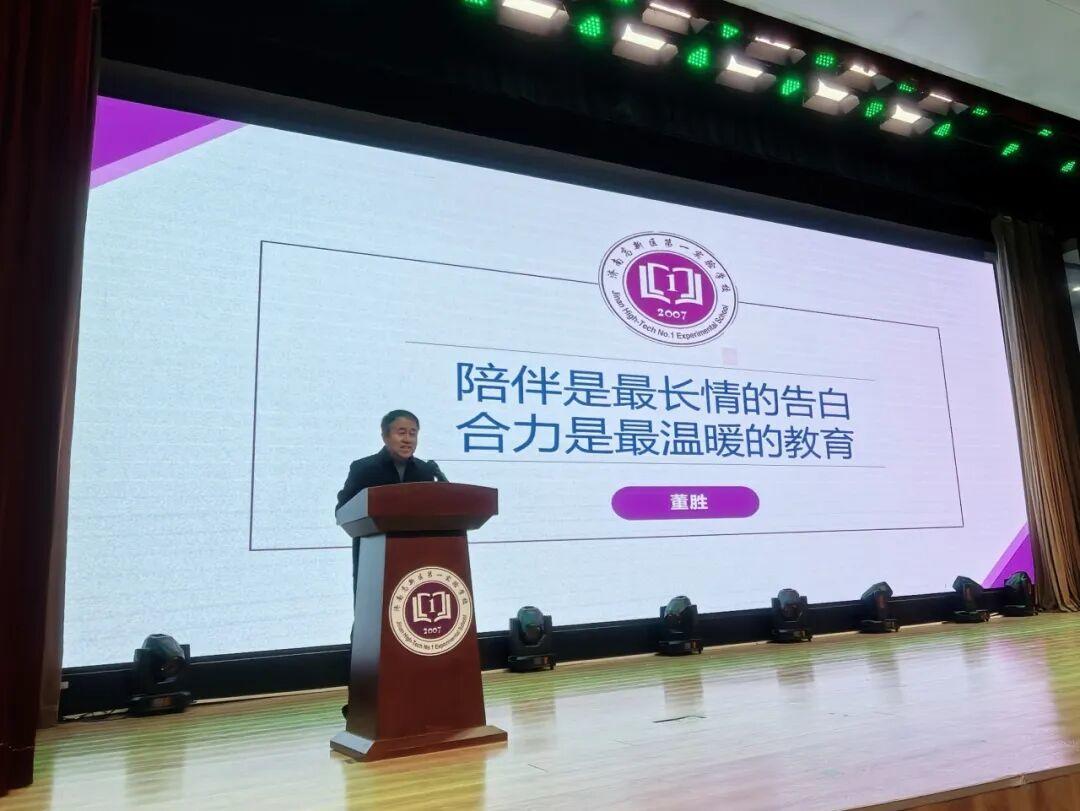 随后,学校校长董胜发表题为“陪伴是最长情的告白,合力是最温暖的教育”的讲话。拥有33年教育工作经验的董胜结合自身丰富的教育管理经历,分享了学校的教育理念与发展愿景。他提出“陪伴关注”与“吸引力合力”两组核心关键词,强调家校需以信任为基石,双向奔赴、坦诚沟通,共同为孩子营造良好的成长环境。