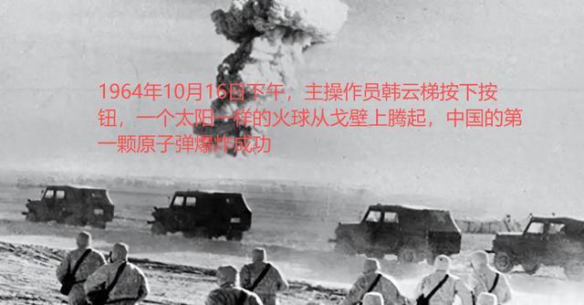 1964年10月16日下午,主操作员韩云梯按下按钮,一个太阳一样的火球从戈壁上腾起,中国的第一颗原子弹爆炸成功。从这一天开始,世界上的核俱乐部里多了第五个成员。