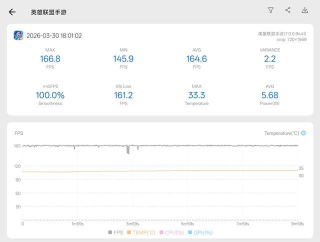 我直接给大家测了个《英雄联盟手游》,风扇全开的情况下,帧率还是很稳定的,根据Scene 9的记录,整局大乱斗下来平均帧率164.64帧,算是把165Hz屏幕的红利给吃满了。
