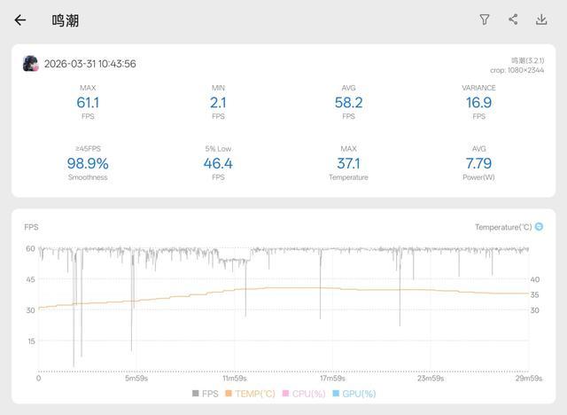 即便如此,OPPO K15 Pro+依然很难征服《鸣潮》,在星炬学院里开摩托还是稳定掉帧,只是现在离开星炬学院后,机身温度很快就能恢复正常,平均帧数58.2帧,基本可以流畅游玩了。