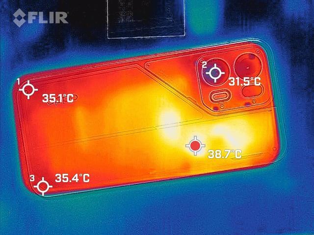 就是温度这块并没有大家想象得那么低,半小时LOLM下来,最高温出现在Deco附近的位置,38.7°C,也是跟没有风扇的同芯片产品拉不开差距...