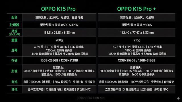 这回OPPO一共端来K15 Pro和K15 Pro+两款机器,Pro是天玑8500,而Pro+用的是天玑9500s,除了处理器方面,其余的配置这次也做了差异化,分成了大屏和小屏两种定位。