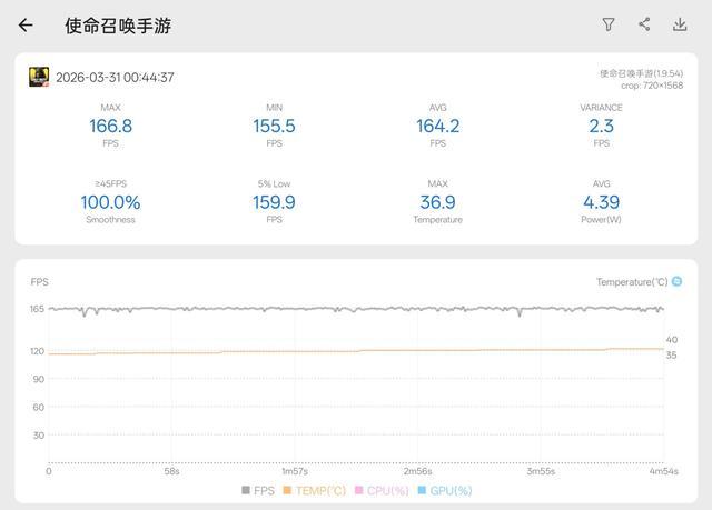 再测一下射击游戏,这里我选的是《使命召唤手游》,风扇全开的情况下,平均帧数达到164.19帧,像这类中低负载的主流手游,OPPO K15 Pro+都可以在刷新率全开的基础上畅玩。
