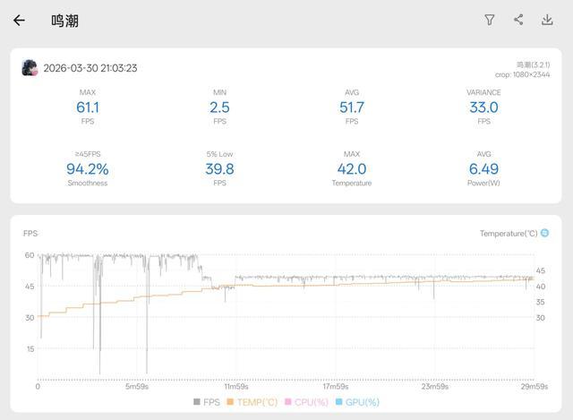 在大地图打怪跑图的时候,平均帧率还能稳定在60帧左右,机身温度还是维持在四十来度;一旦进到星炬学院,开起我心爱的小摩托,整机功耗立马上涨,过一会就锁在50帧左右,最后平均帧率51.7帧。