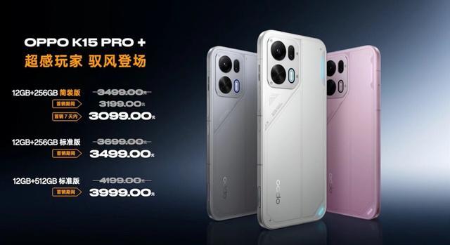 价格方面,OPPO K15 Pro+ 12+256GB(简装版)首发价3199元、12+256GB(标准版)首发价3499元,12+512GB首发价3999元。