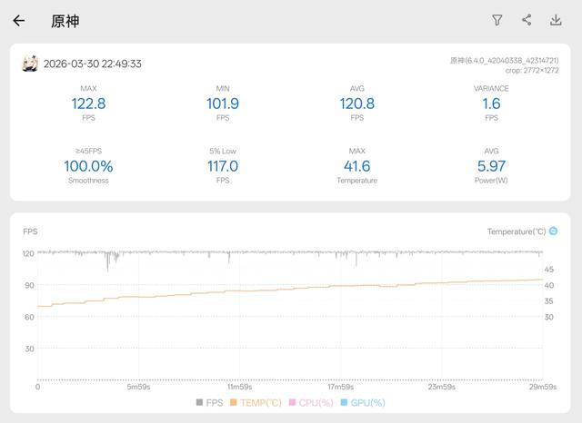 你别说,这次帧数也挺稳定的。半小时跑下来,平均帧数达到了120.81帧,5%Low帧也有117帧,就是整机温度更高了,接近39.5°C的水平,甚至比没有风扇的同定位产品还高一些。