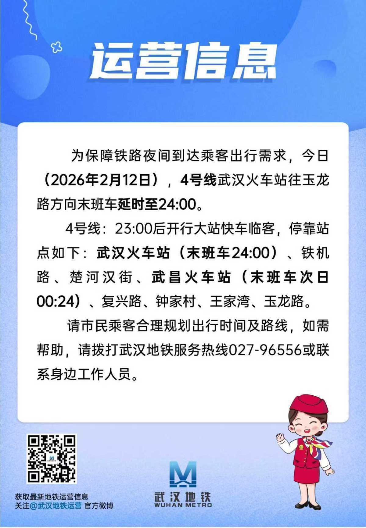 极目新闻记者从武汉地铁处获悉,今日(2月12日),4号线武汉火车站往玉龙路方向末班车延时至24:00。