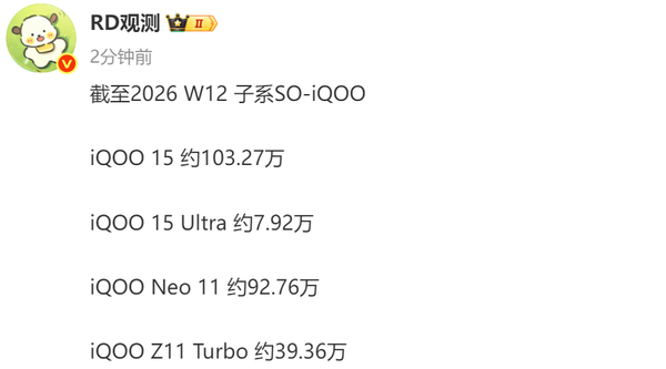 【CNMO科技消息】3月31日,CNMO注意到炒股配资正规平台,有数码博主曝光了iQOO品牌的新一代机型最新销量数据:截至2026年第12周,iQOO 15的销量约为103.27万部、iQOO 15 Ultra的销量约为7.92万部、iQOO Neo 11的销量约为92.76万部、iQOO Z11 Turbo的销量约为39.36万部。