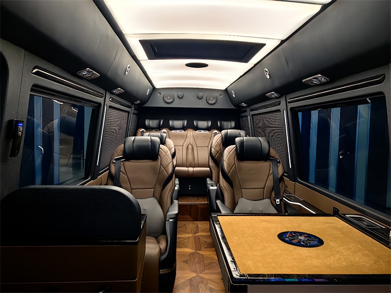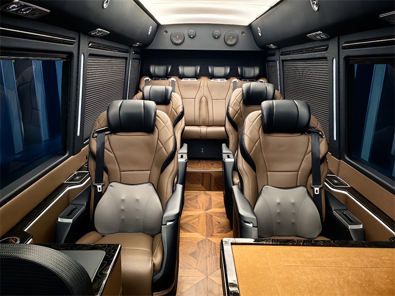 走进车内,奢华与舒适感扑面而来。内饰采用桃木内饰+NAPPA皮质包覆,搭配高密度南美柚木地板,从材质上彰显高端;2-2-2-2-4的座椅布局科学合理,主客座椅均支持电动调节,主副驾配备通风加热功能,后排更是搭载WOWSEN航空头等舱座椅——支持八项主动调节+旋转、人体工程学电动腿托与六点位智能气动按摩,第三排座椅还能一键放倒成沙发床,让长途出行也能随时放松。全车多处无线充电、温控智能车载冰箱、智能温控饮水机与独立分区空调,更从细节处满足乘客的多样需求。